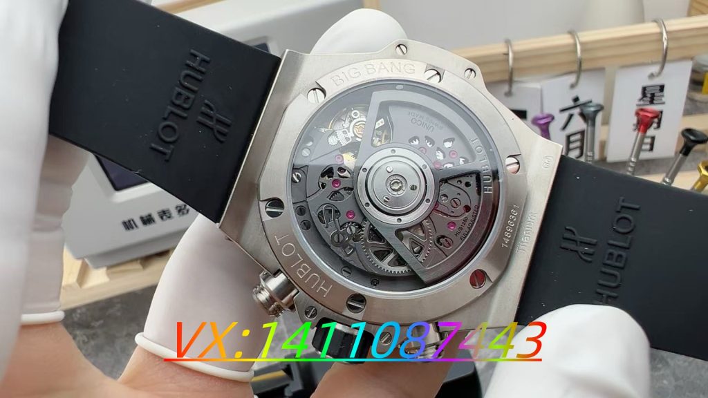 背面依舊采用了螺絲固定的設(shè)計,不僅牢固可靠,而且增添了手表的機械感。背面的字體清晰立體,透底的設(shè)計使得機芯的運轉(zhuǎn)清晰可見。此次 BBF 廠采用了 7750 機芯改制原版 HUB1280,使得機芯在穩(wěn)定性方面表現(xiàn)出色,同時也保留了原版機芯的精髓。