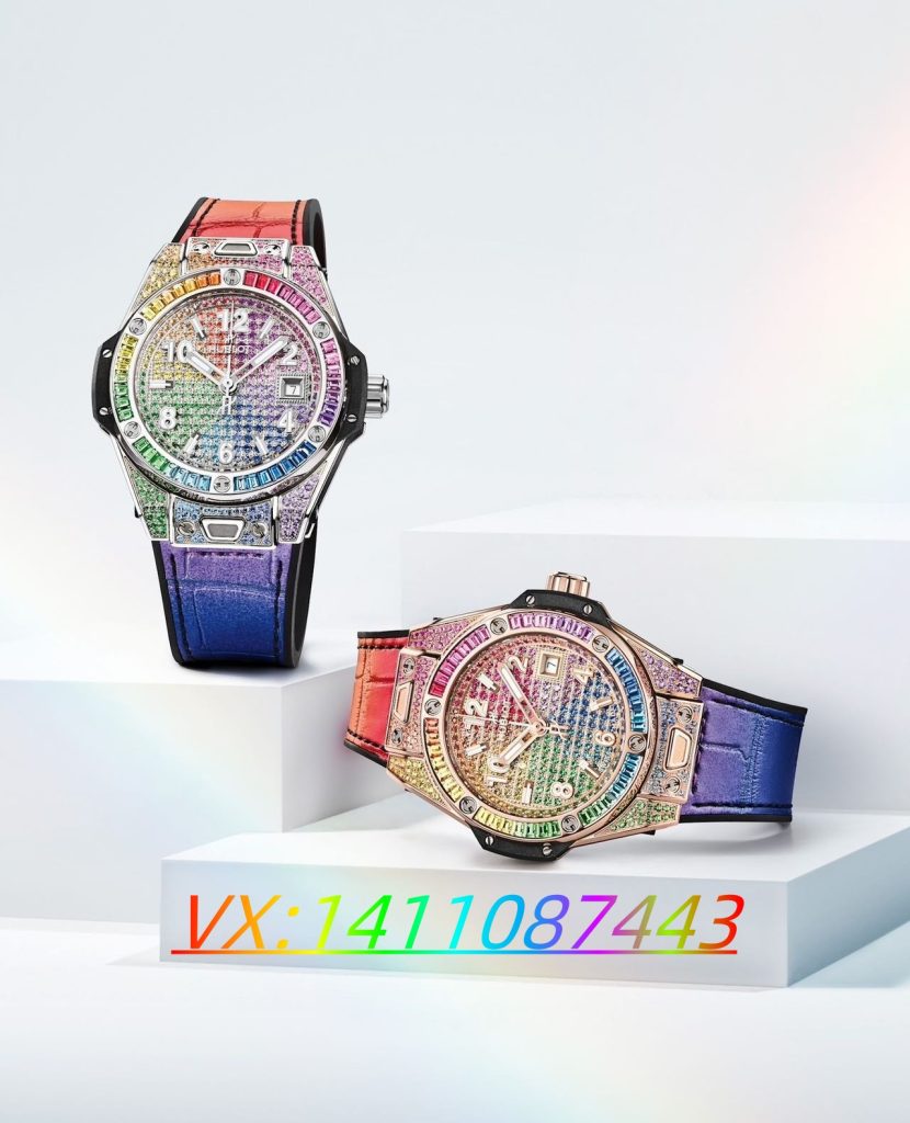 工藝細(xì)節(jié)上,Big Bang “一鍵式” 精鋼彩虹腕表展現(xiàn)出了令人驚嘆的精湛技藝。表圈鑲嵌的 48 顆長階梯形切割彩色寶石,猶如精心排列的璀璨星辰,勾勒出表盤流暢而優(yōu)雅的輪廓。而表圈與表盤共鑲嵌的 362 顆彩色寶石,更是將奢華與美感推向了極致。這些寶石在光的折射下,以不同的顏色呈現(xiàn),仿佛靈動的彩虹在腕間舞動,每一個角度都散發(fā)著迷人的光彩。這種對寶石鑲嵌工藝的極致追求,不僅展現(xiàn)了宇舶表高超的制表技藝,更體現(xiàn)了其對美的獨特理解與詮釋。?