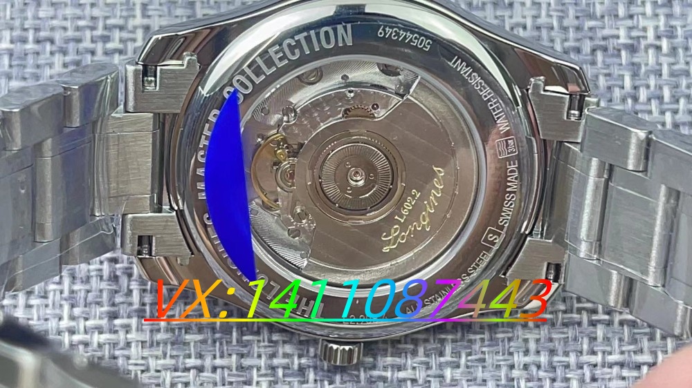 透過(guò)旋入式底蓋的藍(lán)寶石玻璃,我們可以清晰看到機(jī)芯的運(yùn)作狀態(tài)。底蓋內(nèi)側(cè)鐫刻有象征浪琴品牌精神的飛翼沙漏標(biāo)志,字體雕刻深邃立體,邊緣經(jīng)過(guò)精細(xì)打磨,展現(xiàn)出精湛的工藝水準(zhǔn)。機(jī)芯夾板上的日內(nèi)瓦紋與魚鱗紋裝飾雖然不及頂級(jí)腕表那般精致,但紋路清晰均勻,螺絲排列整齊,從細(xì)節(jié)處彰顯了 AF 廠對(duì)品質(zhì)的追求。?